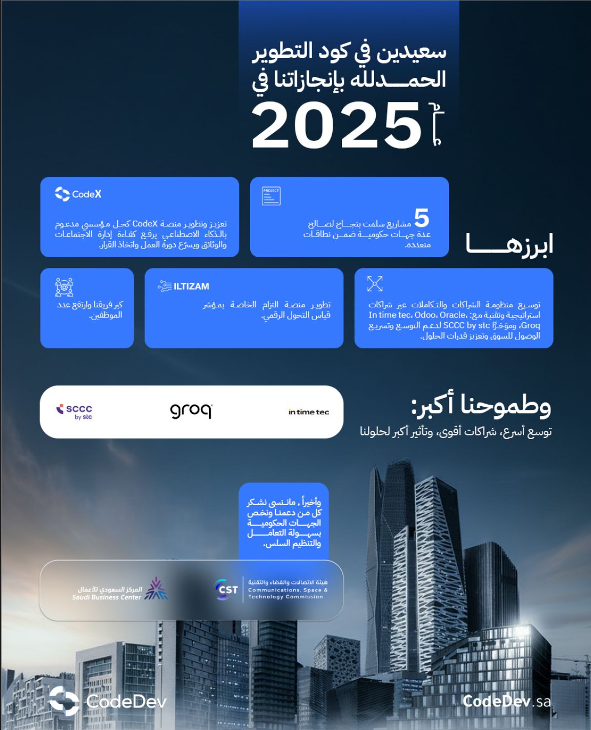 كود التطوير CodeDev هي شركة سعودية متخصصة في بناء الحلول الرقمية والذكاء الاصطناعي، نُمكّن الجهات الحكومية والشركات من تسريع التحول الرقمي وتحقيق نتائج ملموسة.نُطوّر منتجات ذكية مدعومة بالذكاء الاصطناعي، تساهم في تحسين الكفاءة، دعم اتخاذ القرار، وتحقيق التميز التشغيلي. من خلال خبرات وطنية وشراكات تقنية عالمية، نرافق عملاءنا من الفكرة إلى التنفيذ، ونصنع حلولًا تتماشى مع تطلعات رؤية المملكة 2030.