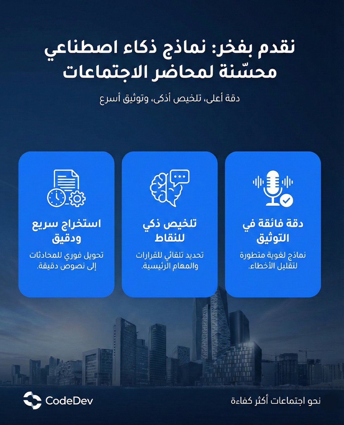 منصة ذكية مدعومة بالذكاء الاصطناعي لتسجيل الاجتماعات بدقة، تفريغها نصيًا بشكل فوري، وإنشاء محاضر منظمة تتضمن القرارات والمهام والمواعيد النهائية..